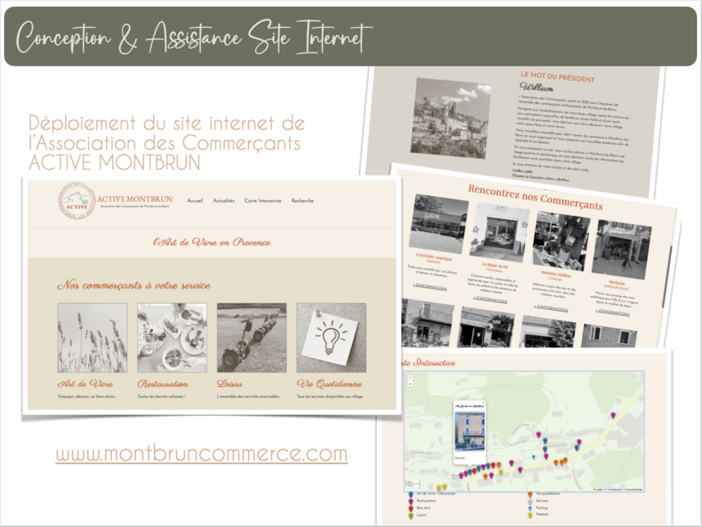 Pour accompagner le renouveau de l’Association ACTIVE MONTBRUN, la création d’un site internet a été préféré à une brochure. Après une écoute attentive des besoins du client, il est clairement apparu que la création de « fiche boutique » serait nécessaire pour présenter chacun des membres de l’Association.